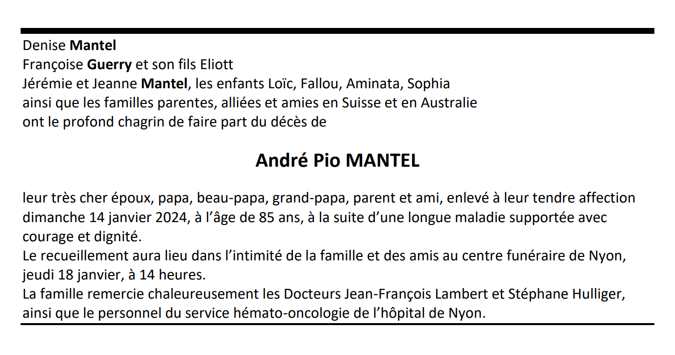 André Pio MANTEL 29 aoû. 1938 - 14 jan. 2024 Avis mortuaire PFG Télecharger PDF Partager sur: Galerie PreviousNext PreviousNext