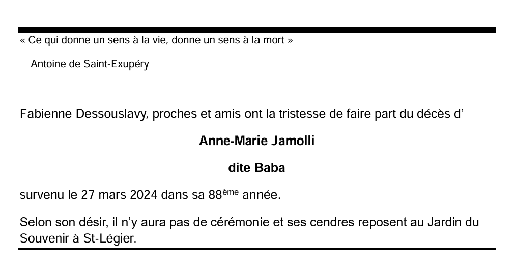 Anne-Marie Jamolli dite Baba 29 juil. 1936 - 27 mar. 2024 Avis mortuaire PFG Télecharger PDF Partager sur: Galerie PreviousNext PreviousNext