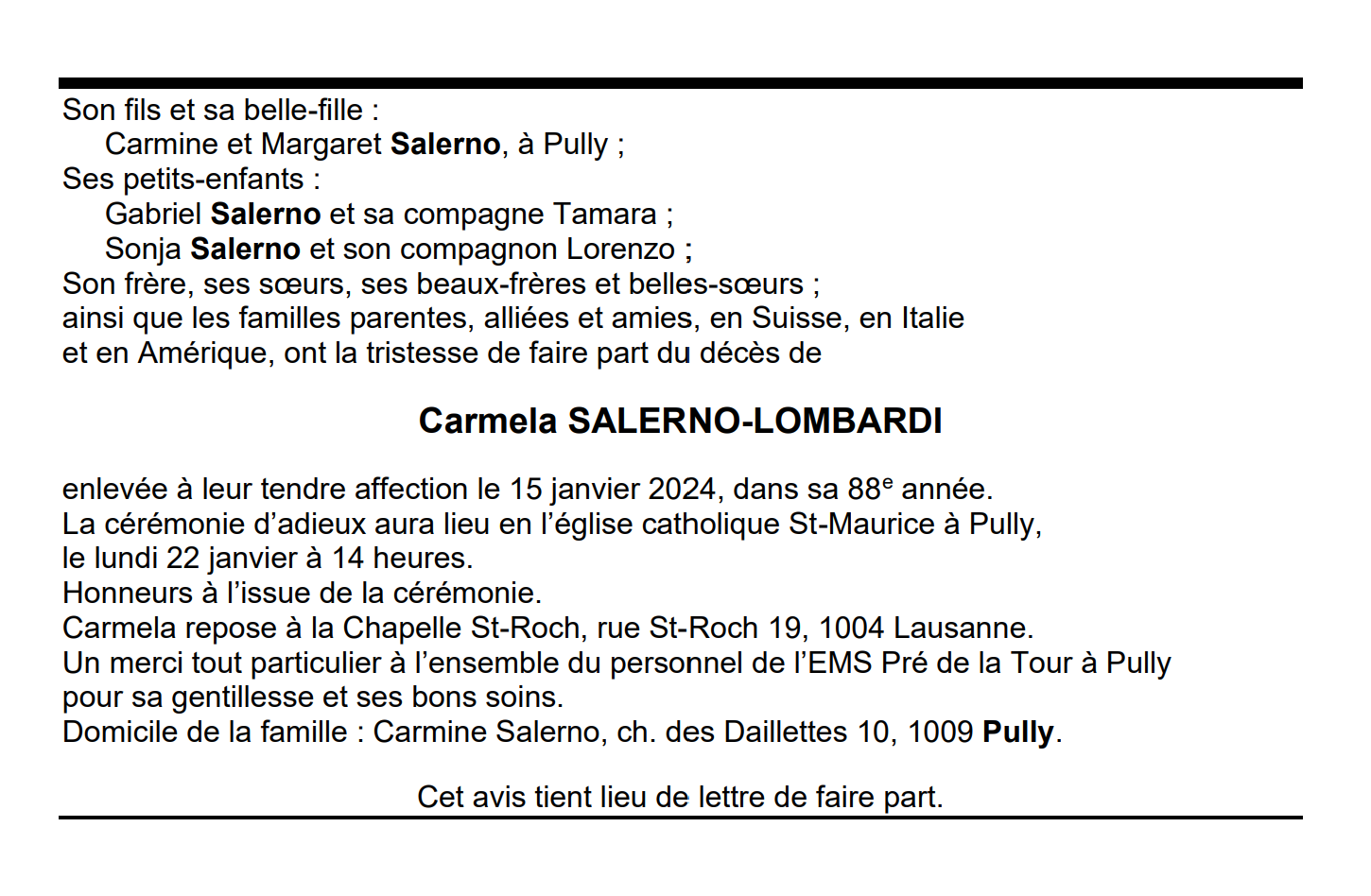 Carmela SALERNO-LOMBARDI 23 sep. 1936 - 15 jan. 2024 Avis mortuaire PFG Télecharger PDF Partager sur: Galerie PreviousNext PreviousNext