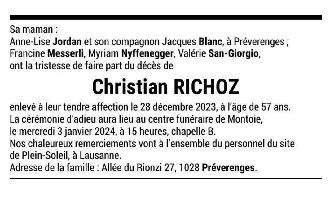 Christian RICHOZ 19 juil. 1966 - 28 déc. 2023 Avis mortuaire PFG Télecharger PDF Partager sur: Galerie PreviousNext PreviousNext