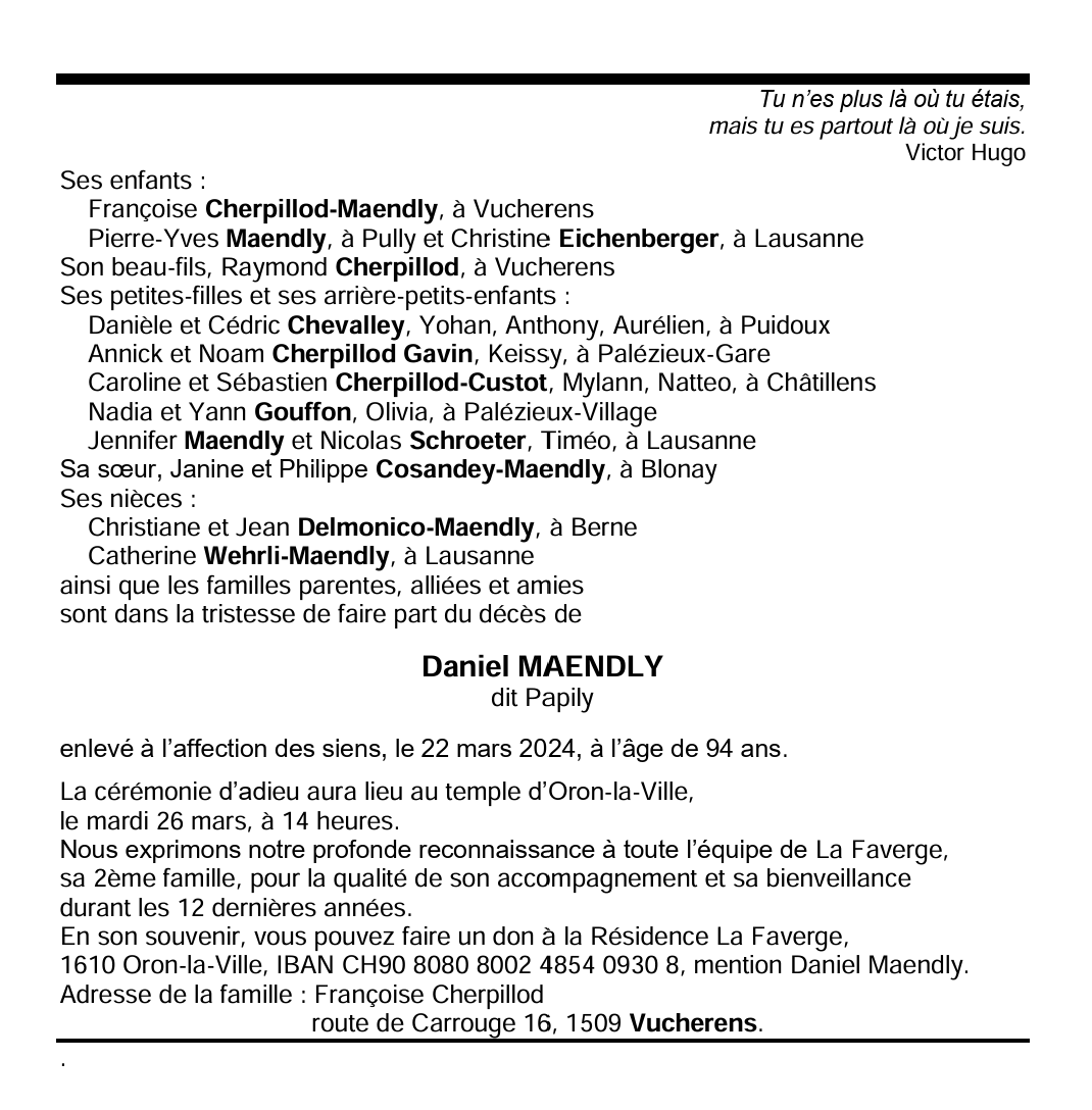 Daniel MAENDLY dit Papily 05 jan. 1930 - 22 mar. 2024 Avis mortuaire PFG Télecharger PDF Partager sur: Galerie PreviousNext PreviousNext