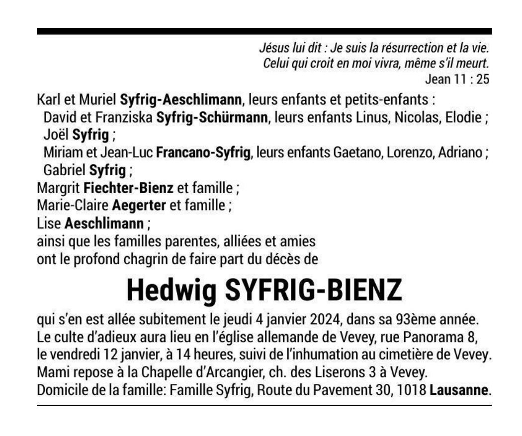 Hedwig SYFRIG-BIENZ 23 sep. 1931 - 04 jan. 2024 Avis mortuaire PFG Télecharger PDF Partager sur: Galerie PreviousNext PreviousNext