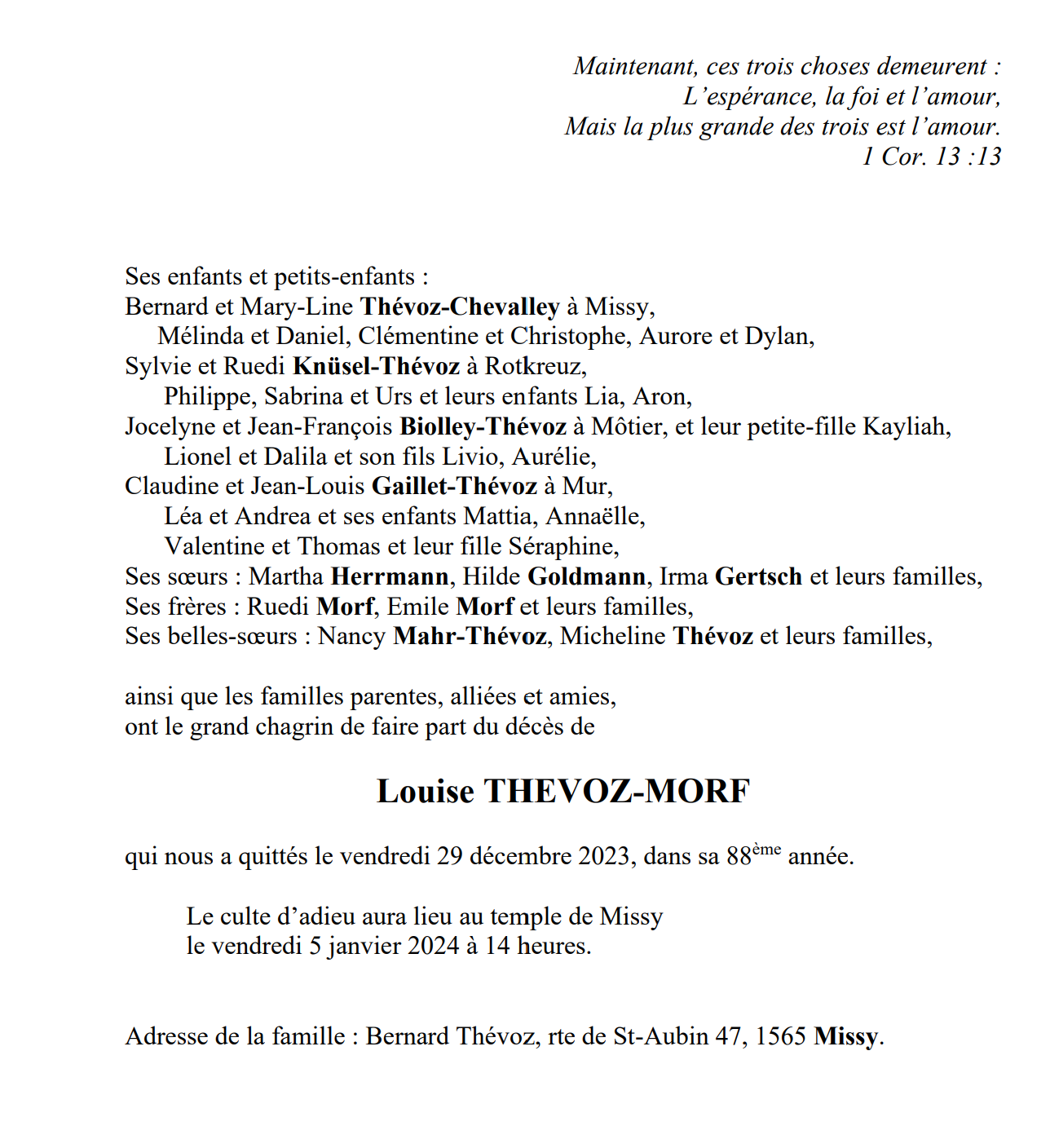 Louise THEVOZ-MORF 27 mai. 1936 - 29 déc. 2023 Avis mortuaire PFG Télecharger PDF Partager sur: Galerie PreviousNext PreviousNext