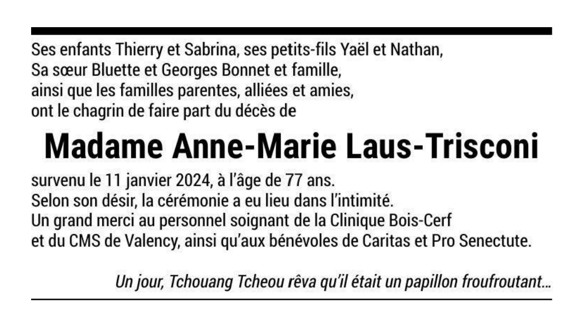 Madame Anne-Marie Laus-Trisconi 24 oct. 1946 - 11 jan. 2024 Avis mortuaire PFG Télecharger PDF Partager sur: Galerie PreviousNext PreviousNext
