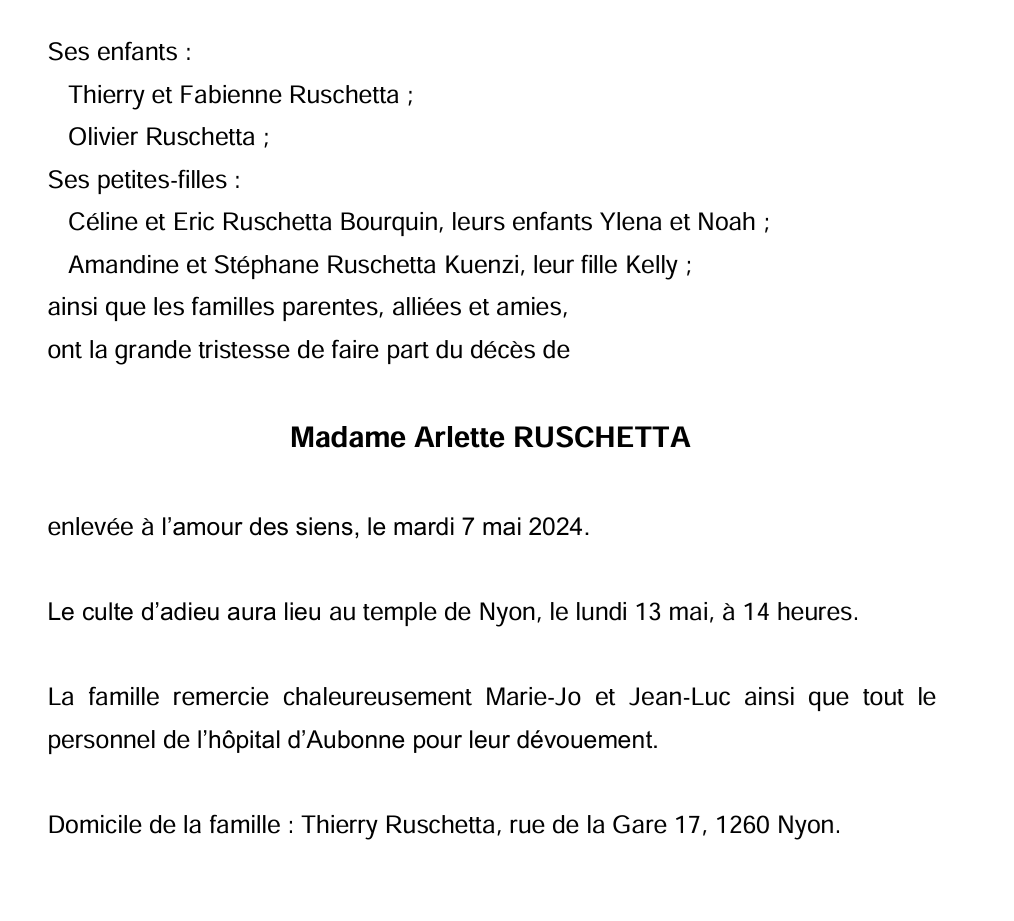 Madame Arlette RUSCHETTA 16 juin. 1943 - 07 mai. 2024 Avis mortuaire PFG Télecharger PDF Partager sur: Galerie PreviousNext PreviousNext