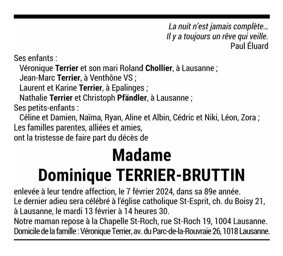 Madame Dominique TERRIER-BRUTTIN 19 mai. 1935 - 07 fév. 2024 Avis mortuaire PFG Télecharger PDF Partager sur: Galerie PreviousNext PreviousNext