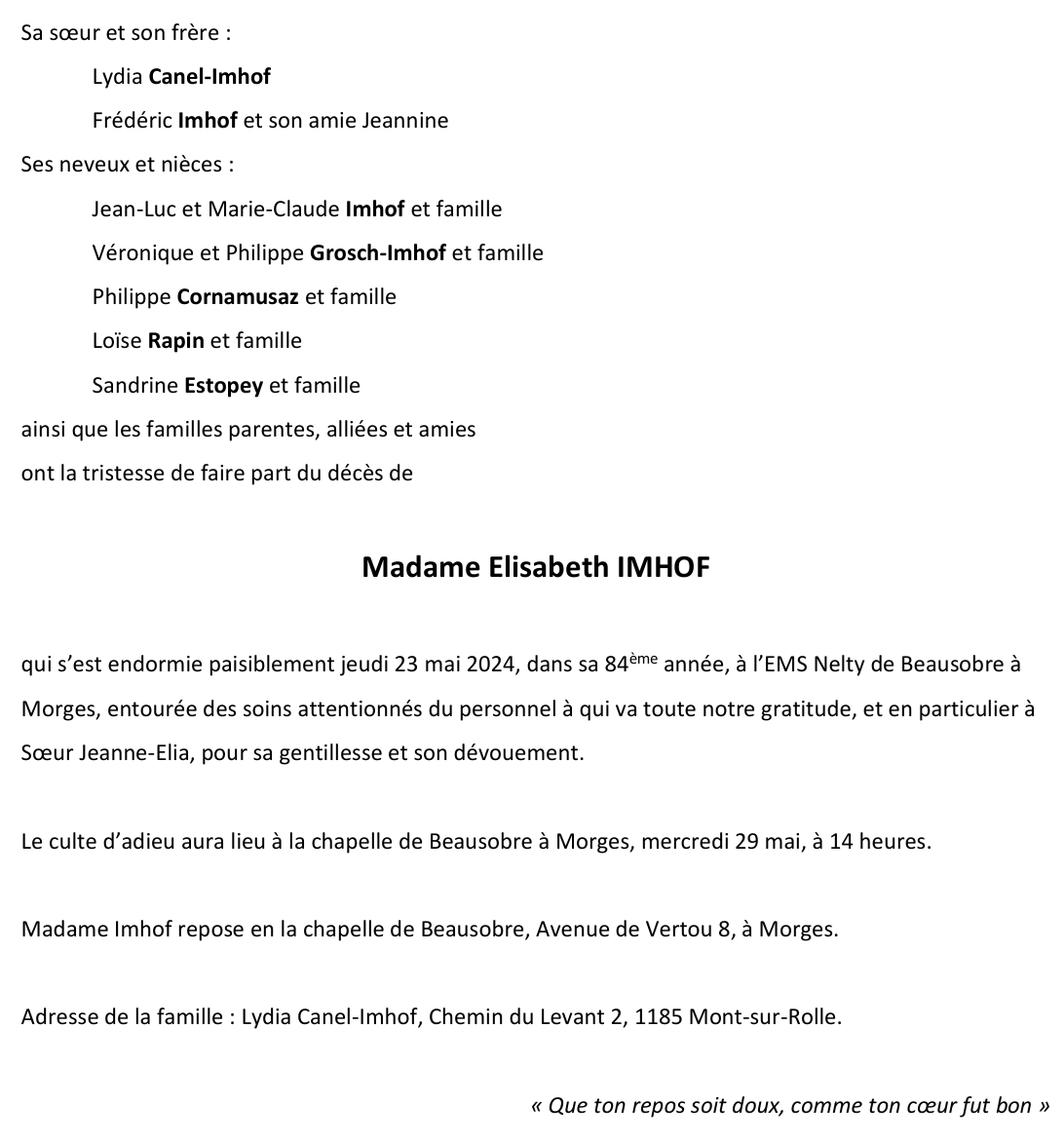 Madame Elisabeth IMHOF 12 aoû. 1940 - 24 mai. 2024 Avis mortuaire PFG Télecharger PDF Partager sur: Galerie PreviousNext PreviousNext