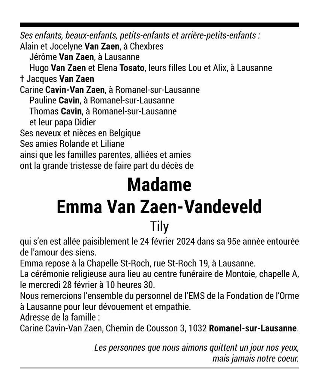 Madame Emma Van Zaen-Vandeveld Tily 04 déc. 1929 - 24 fév. 2024 Avis mortuaire PFG Télecharger PDF Partager sur: Galerie PreviousNext PreviousNext