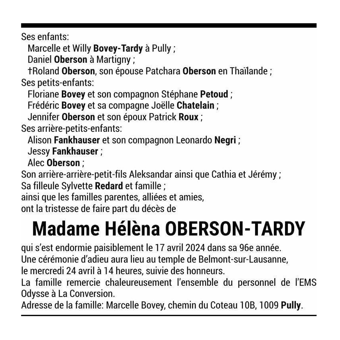Madame Hélèna OBERSON-TARDY 01 jan. 1929 - 17 avr. 2024 Avis mortuaire PFG Télecharger PDF Partager sur: Galerie PreviousNext PreviousNext