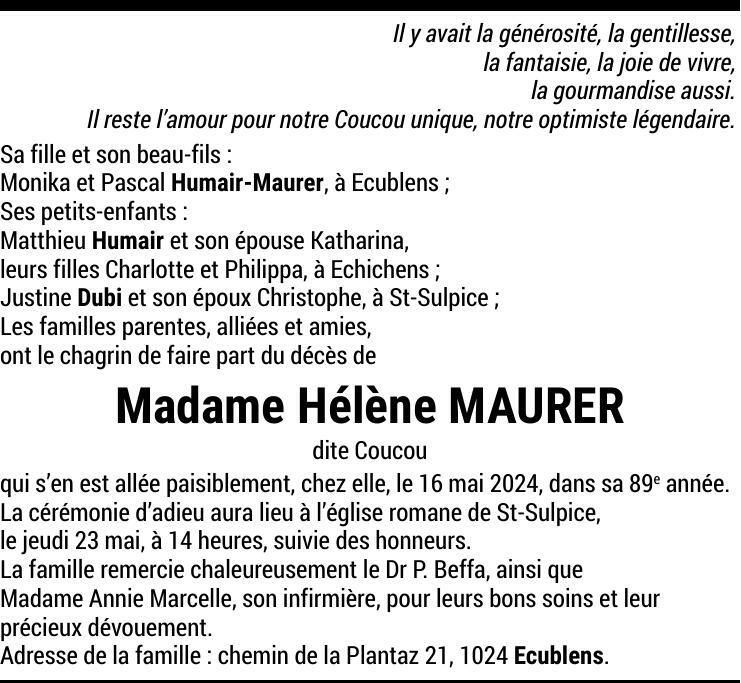 Madame Hélène MAURER 21 oct. 1935 - 16 mai. 2024 Avis mortuaire PFG Partager sur: Galerie PreviousNext PreviousNext