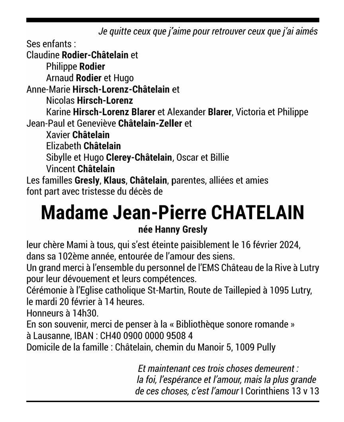 Madame Jean-Pierre CHATELAIN née Hanny Gresly 04 juin. 1922 - 16 fév. 2024 Avis mortuaire PFG Télecharger PDF Partager sur: Galerie PreviousNext PreviousNext