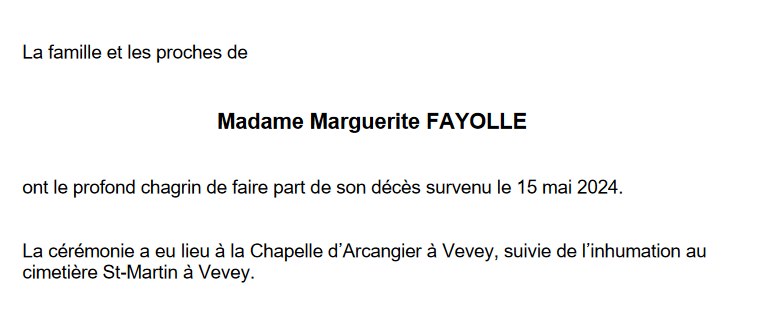 Madame Marguerite FAYOLLE 18 fév. 1927 - 15 mai. 2024 Avis mortuaire PFG Télecharger PDF Partager sur: Galerie PreviousNext PreviousNext