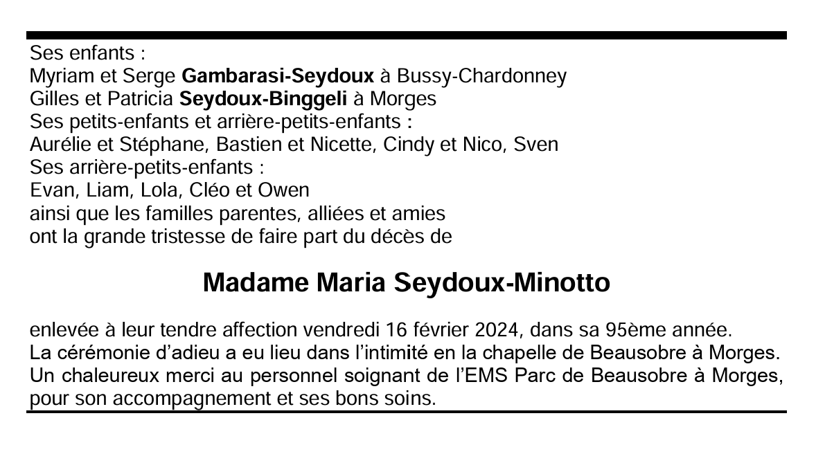 Madame Maria Seydoux-Minotto 28 déc. 1929 - 16 fév. 2024 Avis mortuaire PFG Télecharger PDF Partager sur: Galerie PreviousNext PreviousNext