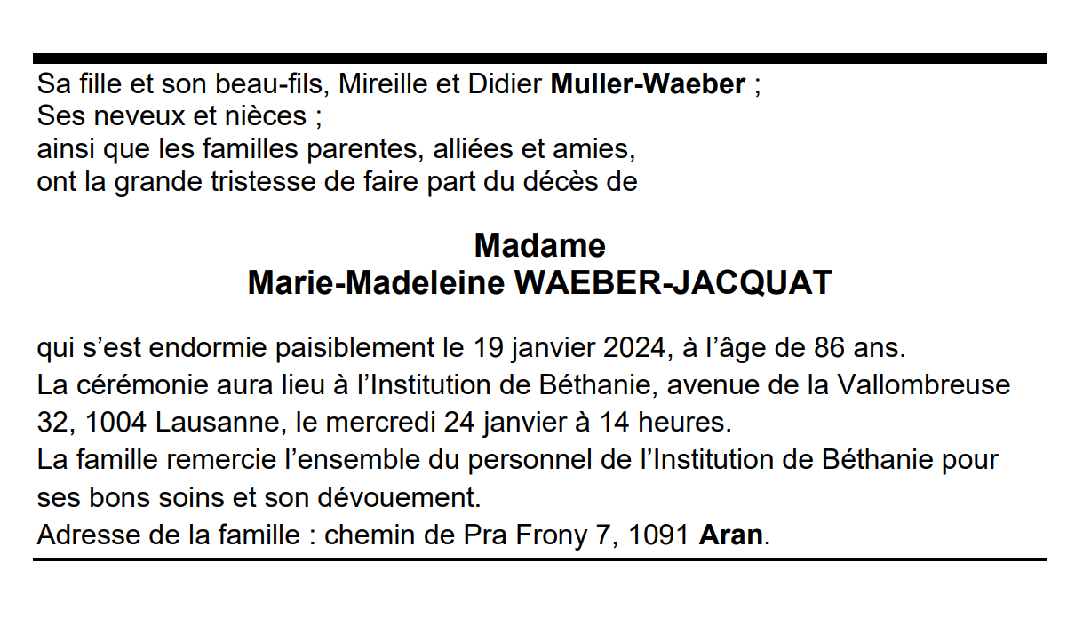 Madame Marie-Madeleine WAEBER-JACQUAT 16 aoû. 1937 - 19 jan. 2024 Avis mortuaire PFG Télecharger PDF Partager sur: Galerie
