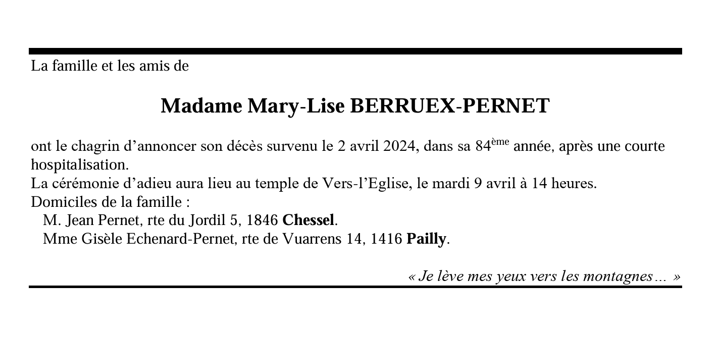 Madame Mary-Lise BERRUEX-PERNET 29 avr. 1940 - 02 avr. 2024 Avis mortuaire PFG Télecharger PDF Partager sur: Galerie PreviousNext PreviousNext