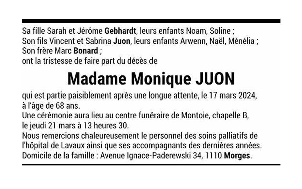 Madame Monique JUON 01 oct. 1955 - 17 mar. 2024 Avis mortuaire PFG Télecharger PDF Partager sur: Galerie PreviousNext PreviousNext