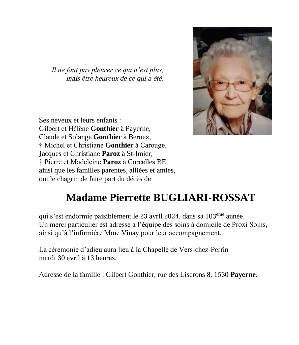 Madame Pierrette BUGLIARI-ROSSAT 20 nov. 1921 - 23 avr. 2024 Avis mortuaire PFG Télecharger PDF Partager sur: Galerie PreviousNext PreviousNext