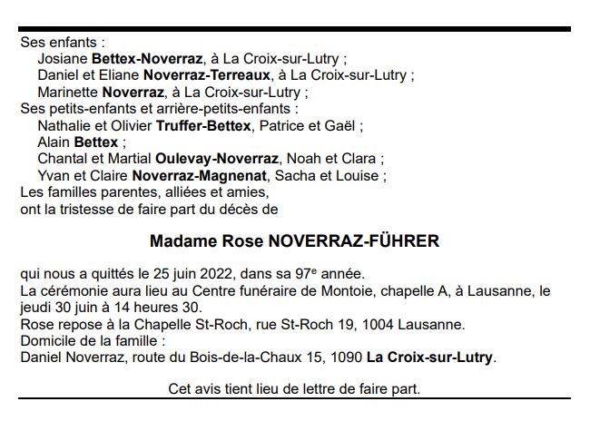 Madame Rose NOVERRAZ-FÜHRER 06 déc. 1925 - 25 juin. 2022 Avis mortuaire PFG Télecharger PDF Partager sur: Galerie PreviousNext PreviousNext