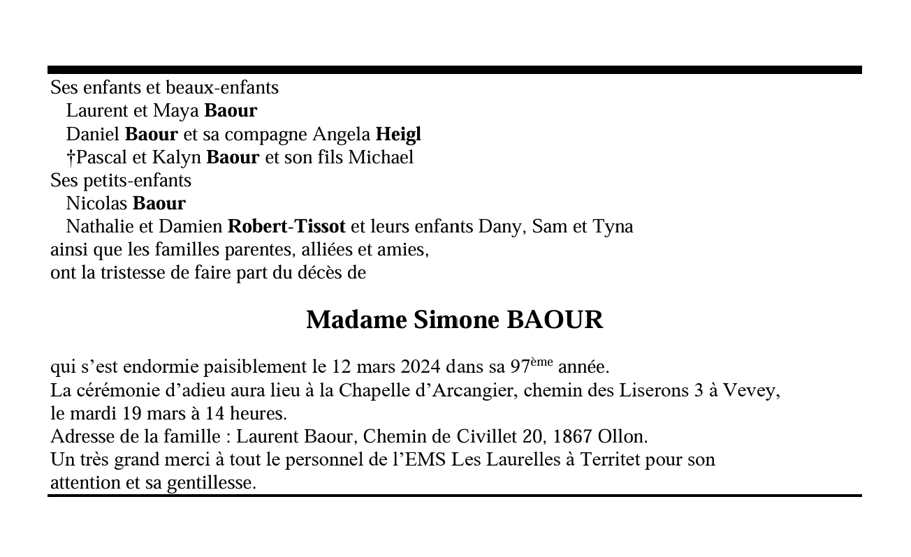 Madame Simone BAOUR 02 mar. 1928 - 12 mar. 2024 Avis mortuaire PFG Télecharger PDF Partager sur: Galerie PreviousNext PreviousNext