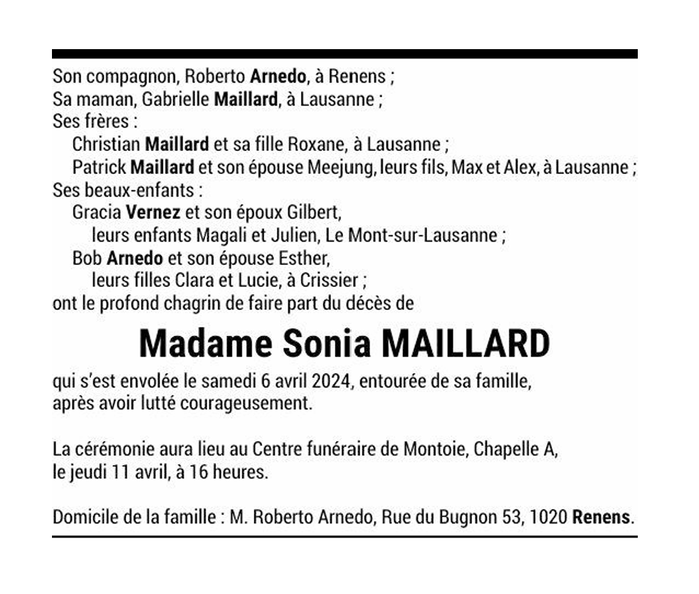 Madame Sonia MAILLARD 29 juil. 1962 - 06 avr. 2024 Avis mortuaire PFG Télecharger PDF Partager sur: Galerie PreviousNext PreviousNext