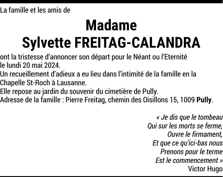 Madame Sylvette FREITAG 30 déc. 1927 - 20 mai. 2024 Avis mortuaire PFG Télecharger PDF Partager sur: Galerie PreviousNext PreviousNext