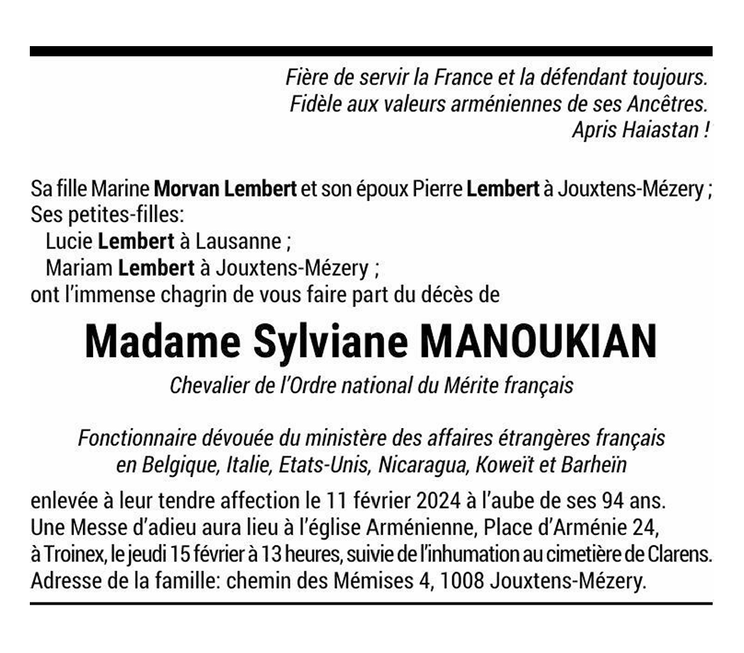 Madame Sylviane MANOUKIAN 27 fév. 1930 - 11 fév. 2024 Avis mortuaire PFG Télecharger PDF Partager sur: Galerie