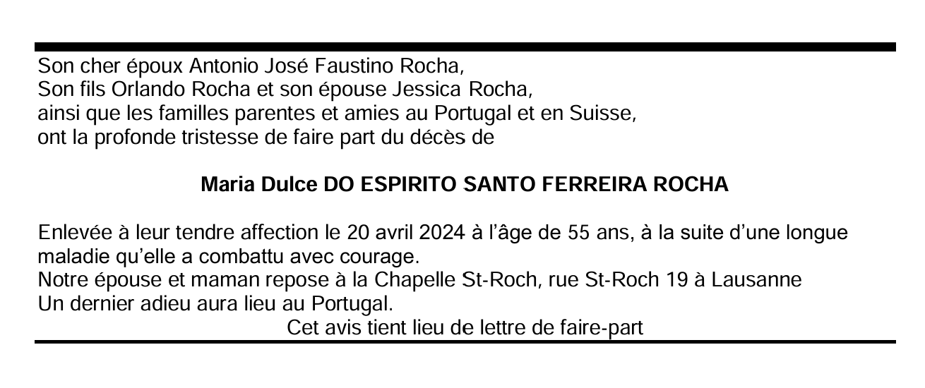 Maria Dulce DO ESPIRITO SANTO FERREIRA ROCHA 01 nov. 1968 - 20 avr. 2024 Avis mortuaire PFG Télecharger PDF Partager sur: Galerie PreviousNext PreviousNext