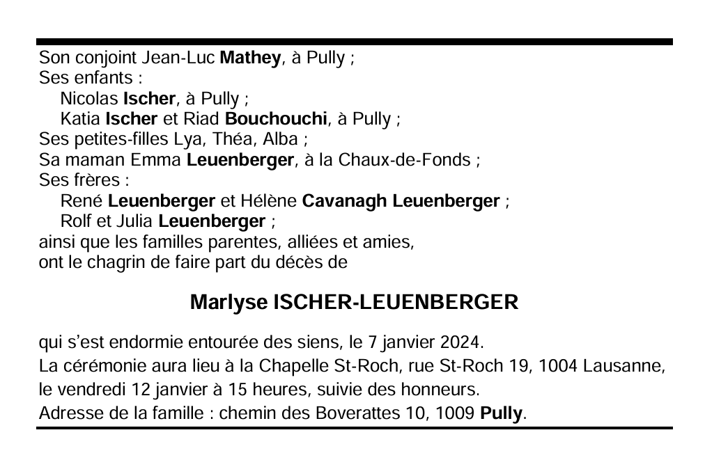 Marlyse ISCHER-LEUENBERGER 18 sep. 1956 - 07 jan. 2024 Avis mortuaire PFG Télecharger PDF Partager sur: Galerie PreviousNext PreviousNext