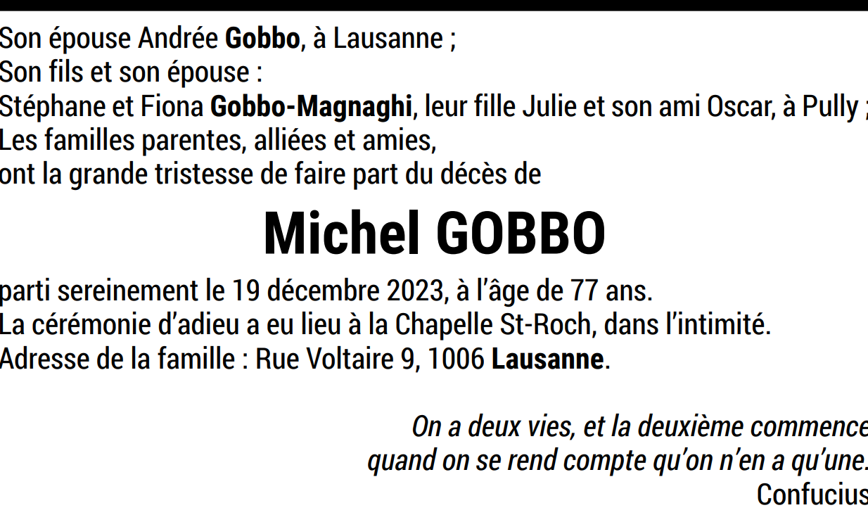Michel GOBBO 01 mai. 1946 - 19 déc. 2023 Avis mortuaire PFG Télecharger PDF Partager sur: Galerie PreviousNext PreviousNext