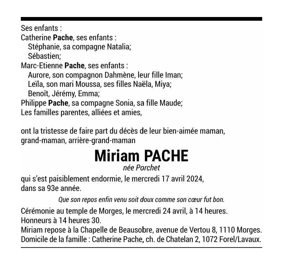 Miriam PACHE née Porchet 17 juil. 1931 - 17 avr. 2024 Avis mortuaire PFG Télecharger PDF Partager sur: Galerie PreviousNext PreviousNext