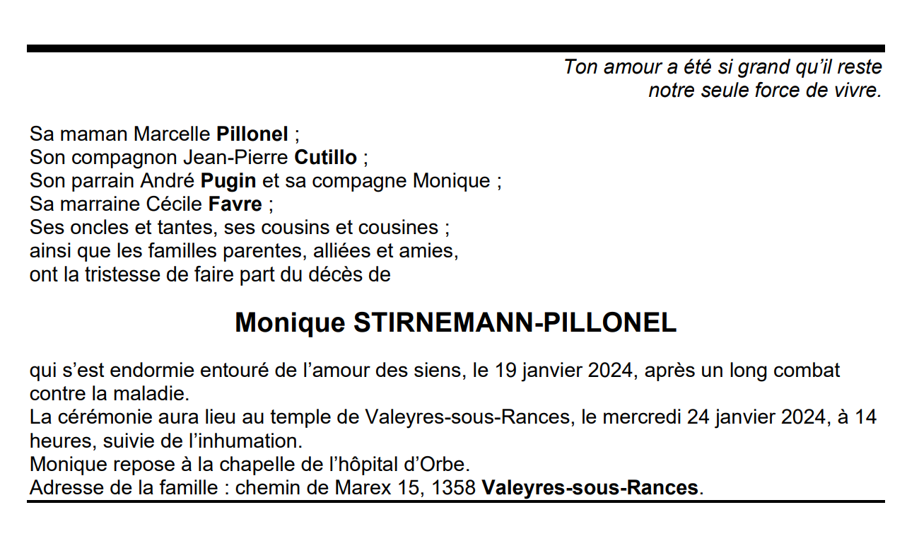 Monique STIRNEMANN-PILLONEL 16 jan. 1962 - 19 jan. 2024 Avis mortuaire PFG Télecharger PDF Partager sur: Galerie PreviousNext PreviousNext