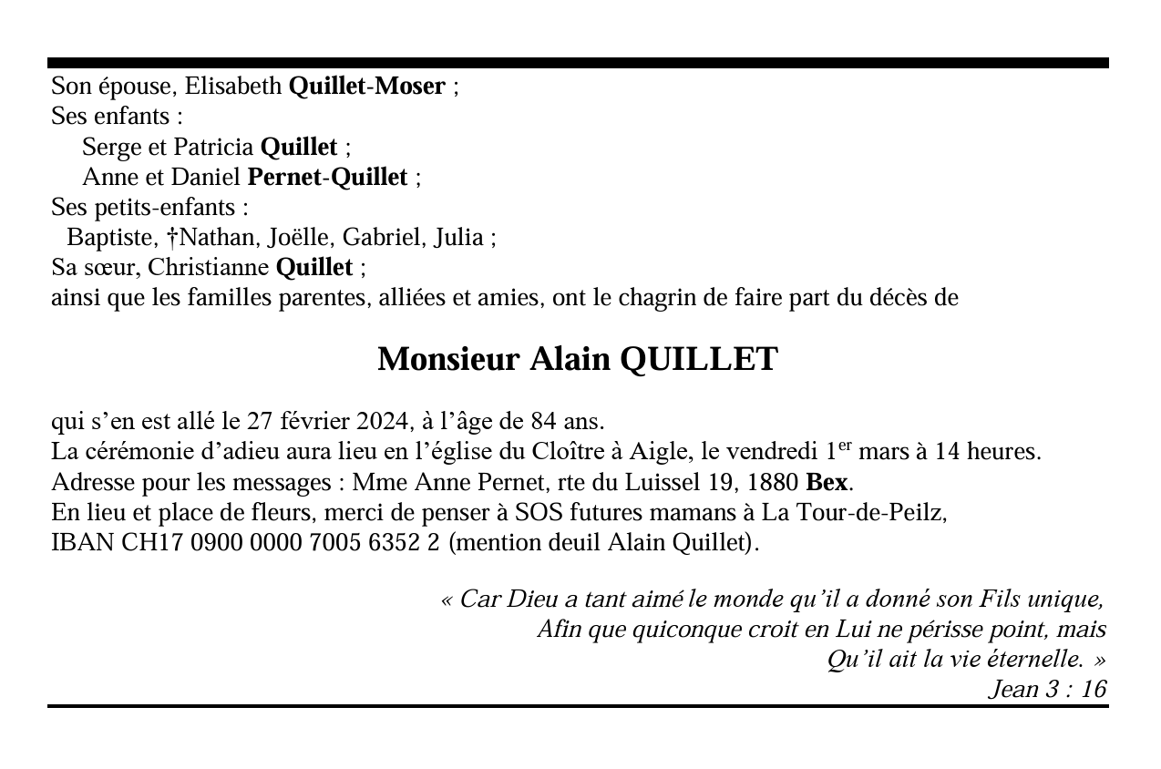 Monsieur Alain QUILLET 22 fév. 1940 - 27 fév. 2024 Avis mortuaire PFG Télecharger PDF Partager sur: Galerie PreviousNext PreviousNext
