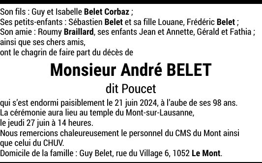 Monsieur André BELET dit Poucet 18 aoû. 1926 - 21 juin. 2024 Avis mortuaire PFG Partager sur: Galerie
