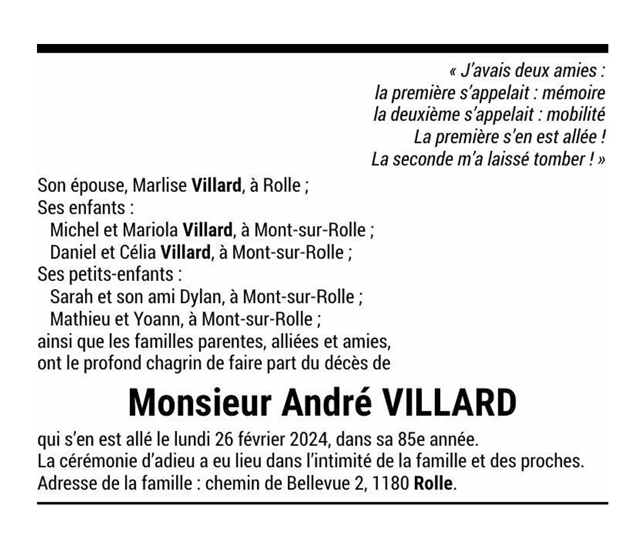 Monsieur André VILLARD 30 aoû. 1939 - 26 fév. 2024 Avis mortuaire PFG Télecharger PDF Partager sur: Galerie PreviousNext PreviousNext