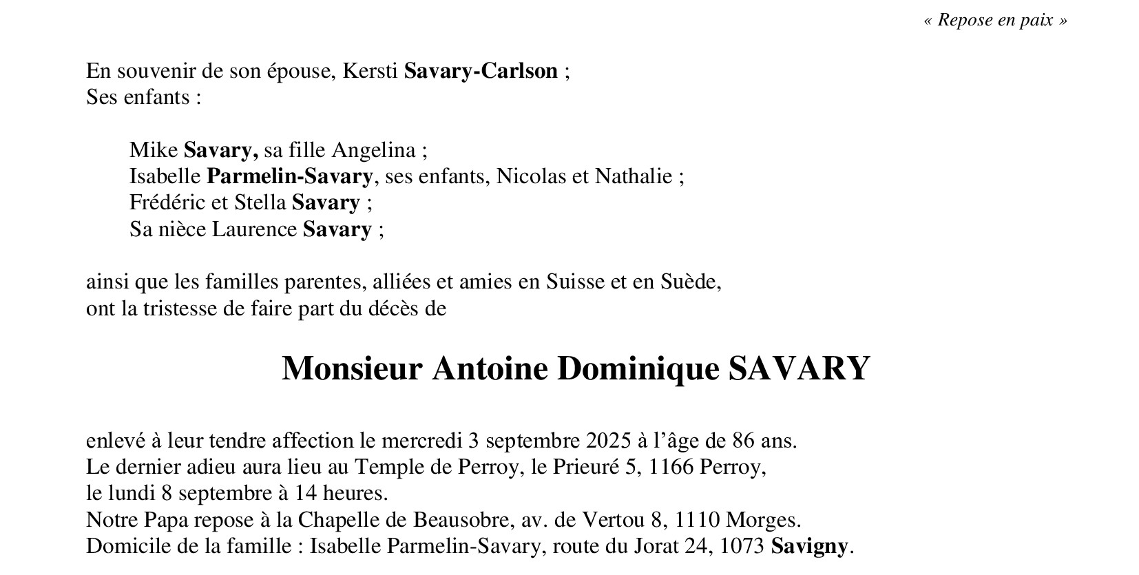 Monsieur Antoine Dominique SAVARY 04 juin. 1939 - 03 sep. 2025 Avis mortuaire PFG Partager sur: Galerie