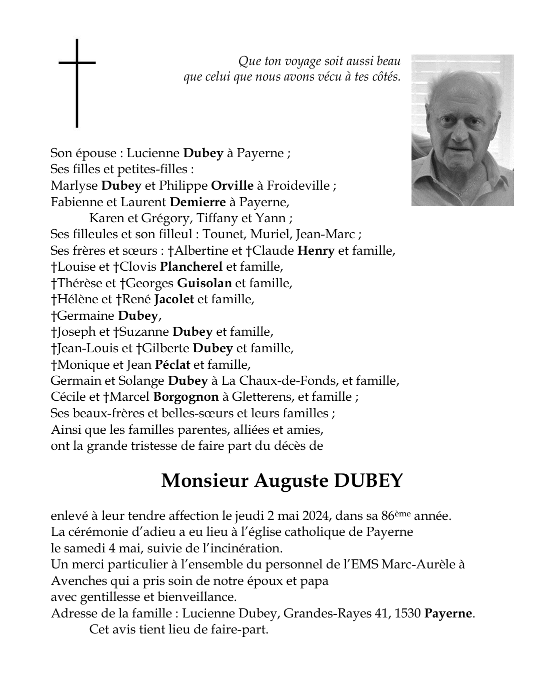 Monsieur Auguste DUBEY 01 juil. 1938 - 02 mai. 2024 Avis mortuaire PFG Télecharger PDF Partager sur: Galerie