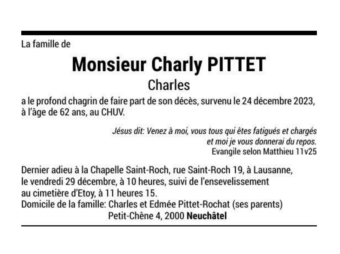 Monsieur Charly PITTET Charles 14 déc. 1961 - 24 déc. 2023 Avis mortuaire PFG Télecharger PDF Partager sur: Galerie PreviousNext PreviousNext