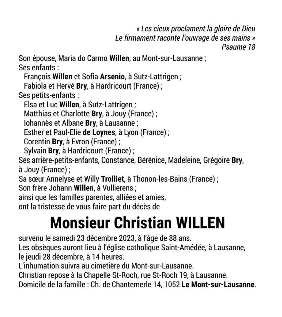 Monsieur Christian WILLEN 30 oct. 1935 - 23 déc. 2023 Avis mortuaire PFG Télecharger PDF Partager sur: Galerie PreviousNext PreviousNext