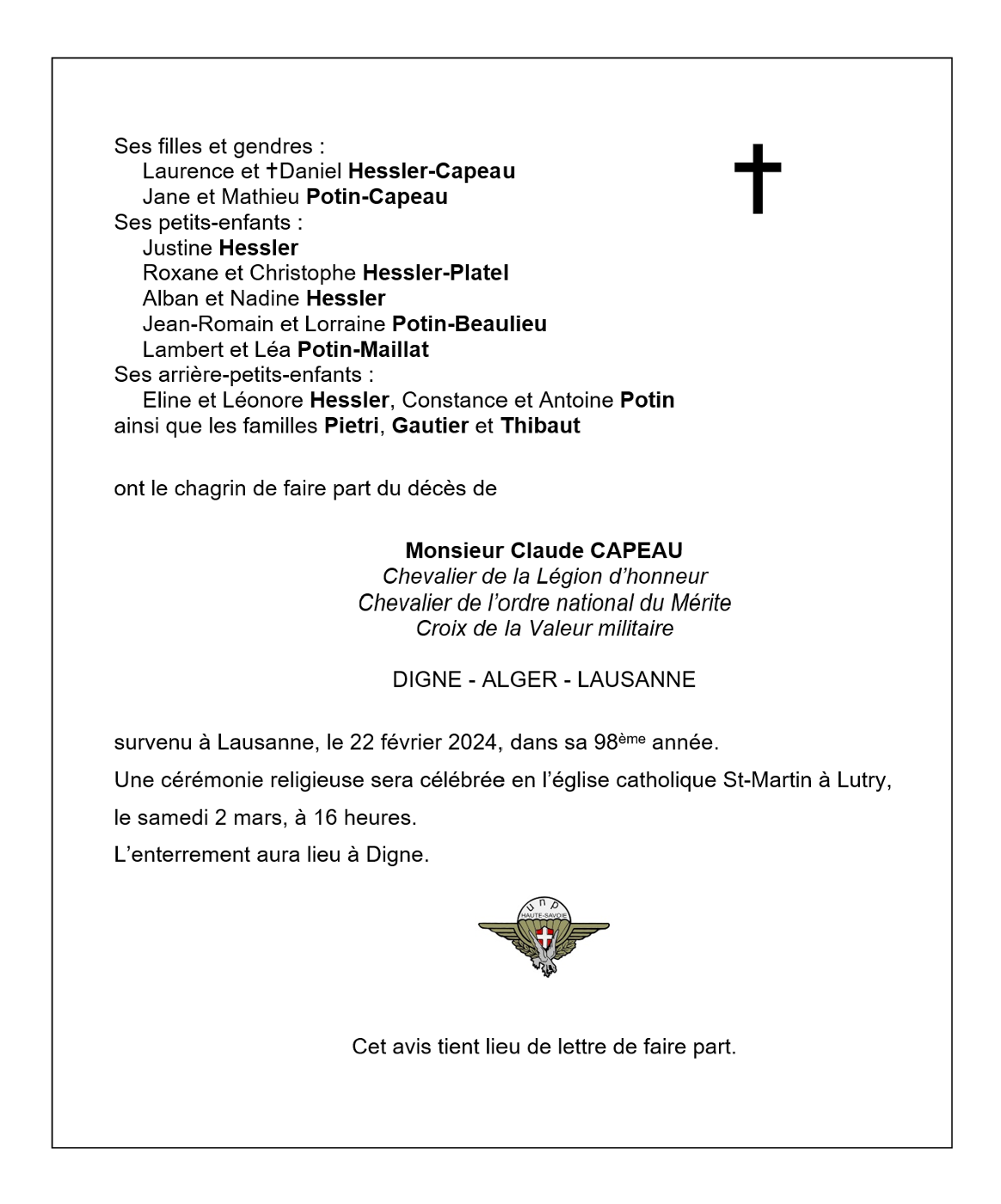 Monsieur Claude CAPEAU 12 avr. 1926 - 22 fév. 2024 Avis mortuaire PFG Télecharger PDF Partager sur: Galerie PreviousNext PreviousNext