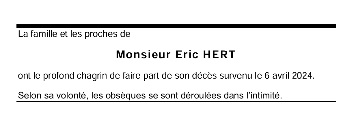 Monsieur Eric HERT 17 mar. 1929 - 06 avr. 2024 Avis mortuaire PFG Télecharger PDF Partager sur: Galerie PreviousNext PreviousNext