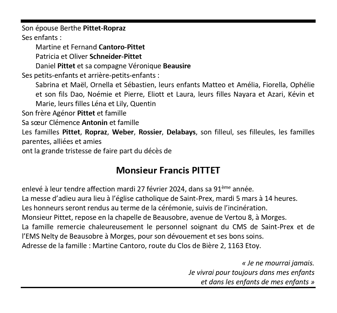 Monsieur Francis PITTET 17 sep. 1933 - 27 fév. 2024 Avis mortuaire PFG Télecharger PDF Partager sur: Galerie PreviousNext PreviousNext