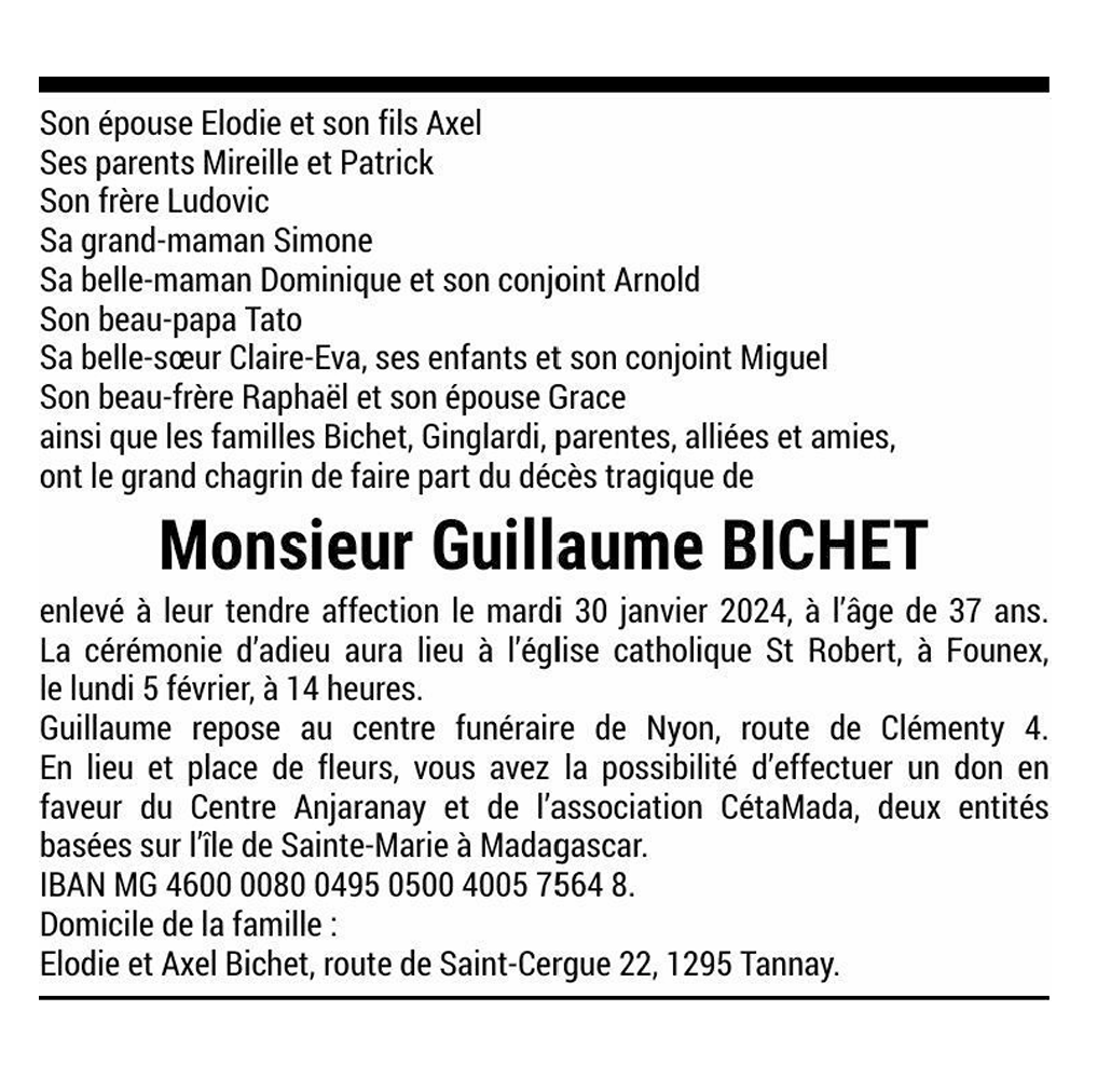 Monsieur Guillaume BICHET 27 fév. 1986 - 30 jan. 2024 Avis mortuaire PFG Télecharger PDF Partager sur: Galerie PreviousNext PreviousNext