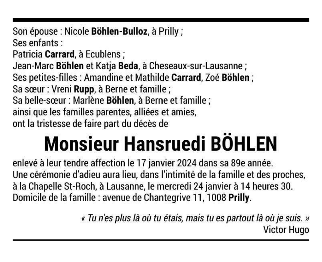 Monsieur Hansruedi BÖHLEN 08 aoû. 1935 - 17 jan. 2024 Avis mortuaire PFG Télecharger PDF Partager sur: Galerie PreviousNext PreviousNext