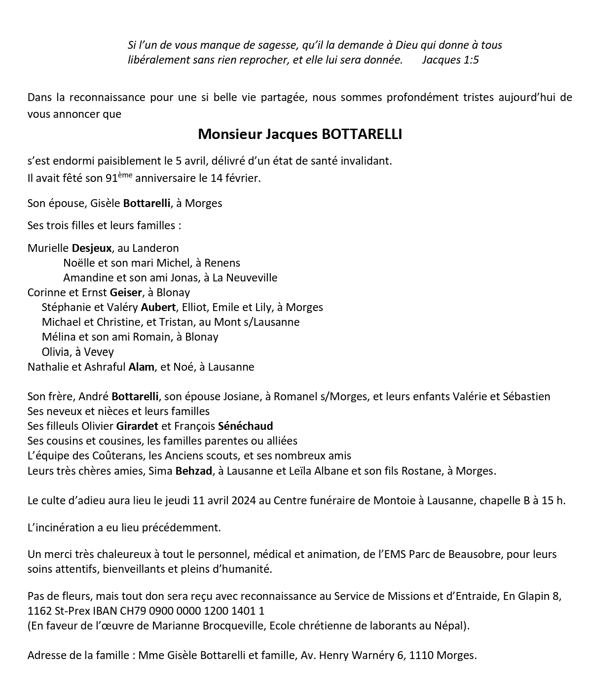 Monsieur Jacques BOTTARELLI 14 fév. 1933 - 05 avr. 2024 Avis mortuaire PFG Télecharger PDF Partager sur: Galerie PreviousNext PreviousNext