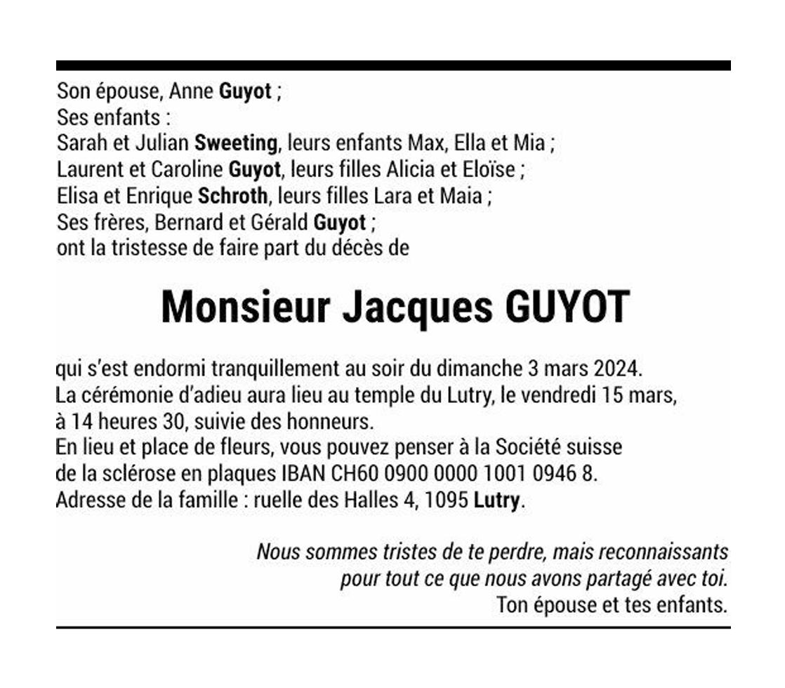 Monsieur Jacques GUYOT 17 fév. 1947 - 03 mar. 2024 Avis mortuaire PFG Télecharger PDF Partager sur: Galerie PreviousNext PreviousNext