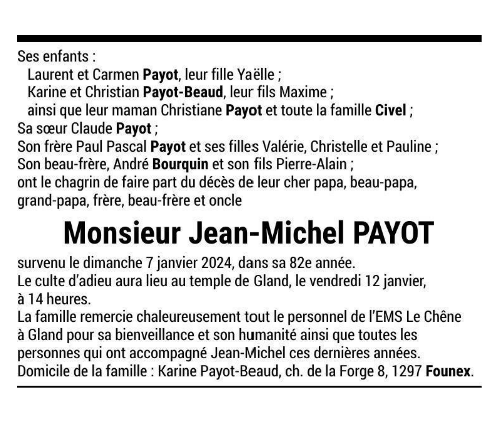 Monsieur Jean-Michel PAYOT 16 mar. 1942 - 07 jan. 2024 Avis mortuaire PFG Télecharger PDF Partager sur: Galerie PreviousNext PreviousNext
