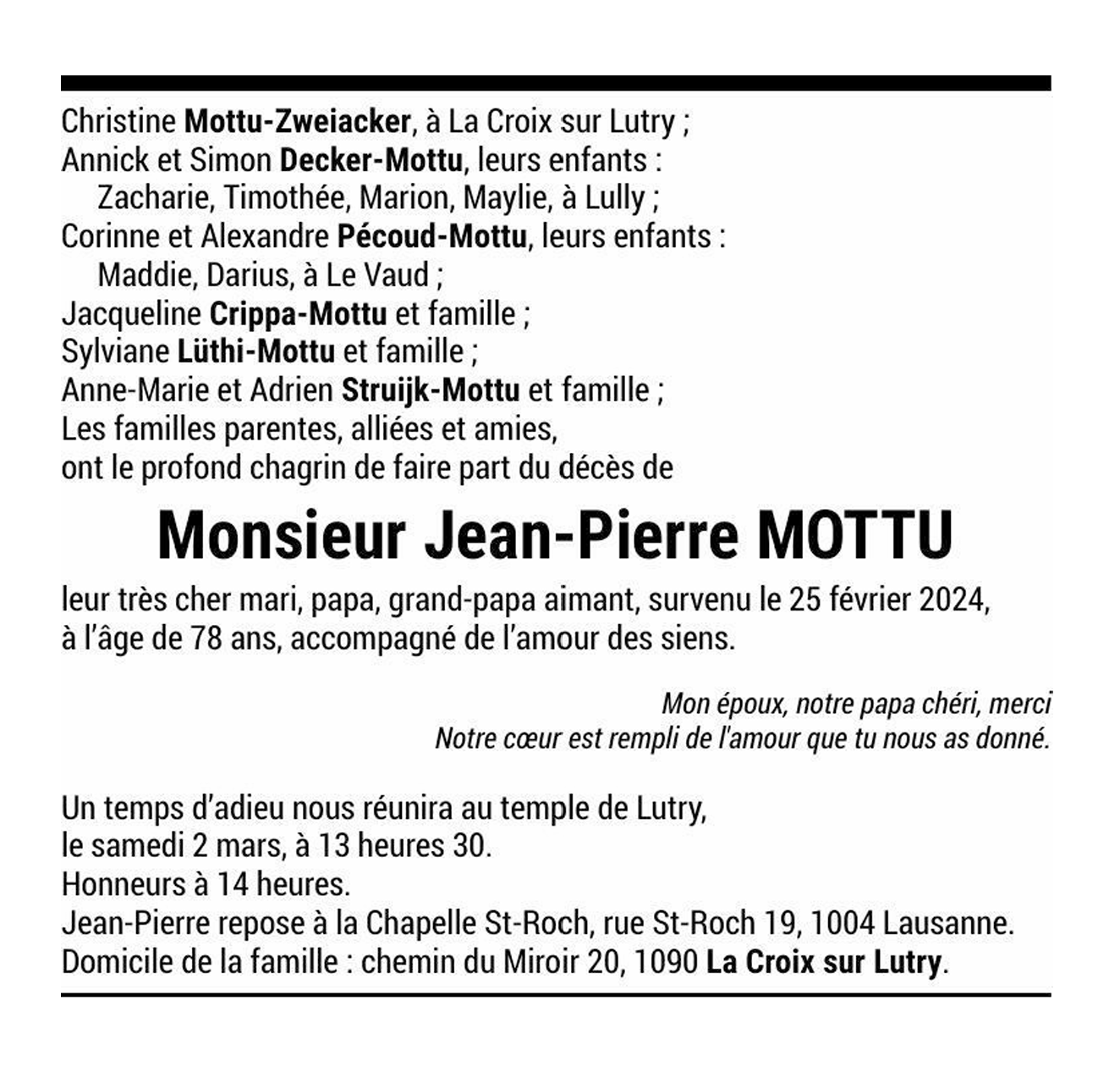 Monsieur Jean-Pierre MOTTU 22 déc. 1945 - 25 fév. 2024 Avis mortuaire PFG Télecharger PDF Partager sur: Galerie PreviousNext PreviousNext