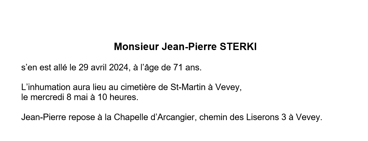 Monsieur Jean-Pierre STERKI 15 nov. 1952 - 29 avr. 2024 Avis mortuaire PFG Télecharger PDF Partager sur: Galerie