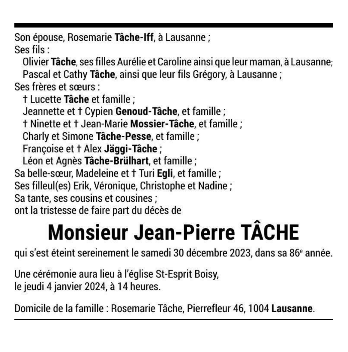 Monsieur Jean-Pierre TÂCHE 02 nov. 1938 - 30 déc. 2023 Avis mortuaire PFG Télecharger PDF Partager sur: Galerie PreviousNext PreviousNext
