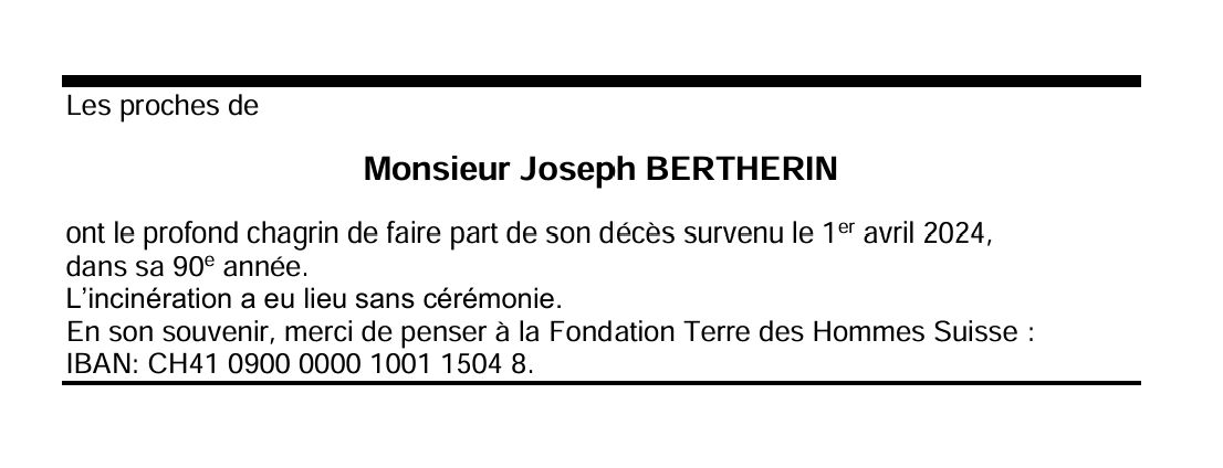 Monsieur Joseph BERTHERIN 06 mai. 1934 - 01 avr. 2024 Avis mortuaire PFG Télecharger PDF Partager sur: Galerie PreviousNext PreviousNext